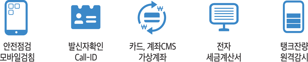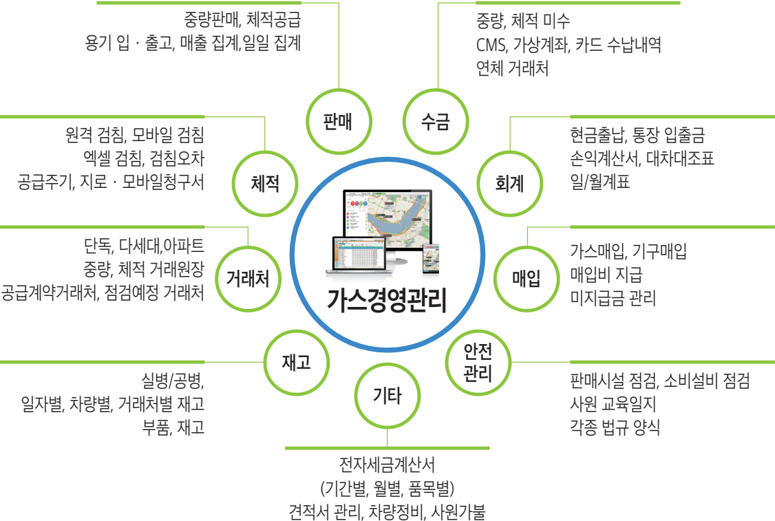 판매 - 일반판매, 체적공급, 검침등록 , 수금등록, 안전점검 - 소비설비 안전점검, 저장탱크 안전점검, CID, 거래장부 조회 등의 기능을 제공합니다.