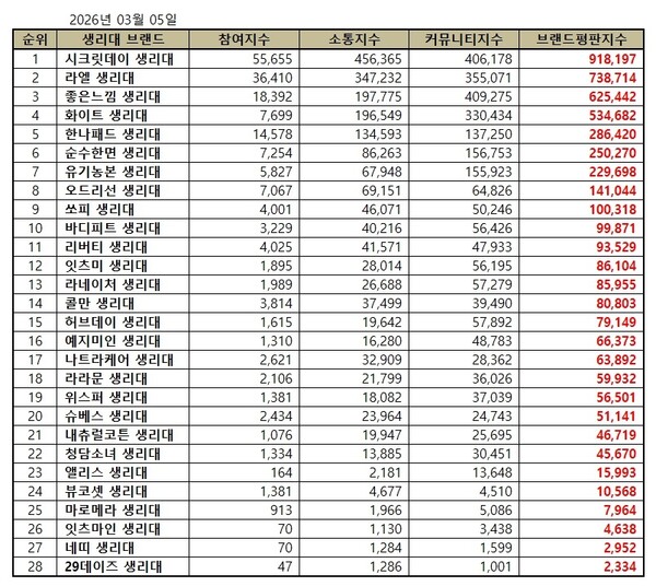 한국기업평판연구소는 국내 소비자에게 사랑받는 생리대 브랜드 28개에 대해 2026년 2월 5일부터 2026년 3월 5일까지의 생리대 브랜드 빅데이터 4,784,872개를 분석한 결과 지난 2월 생리대 브랜드 빅데이터 4,603,032개와 비교하면 3.95% 증가했다고 밝혔다.