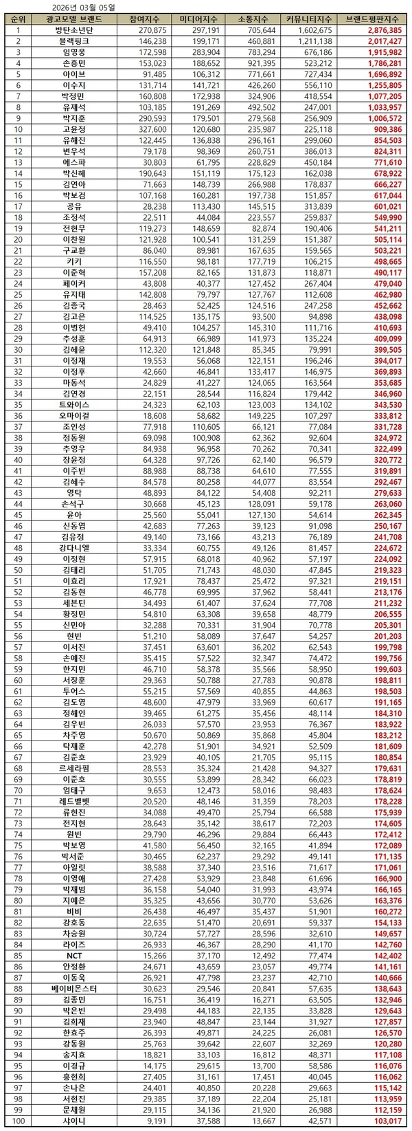 2026년 3월 광고모델 브랜드평판 30위 순위는 방탄소년단, 블랙핑크, 임영웅, 손흥민, 아이브, 이수지, 박정민, 유재석, 박지훈, 고윤정, 유해진, 변우석, 에스파, 박신혜, 김연아, 박보검, 공유, 조정석, 전현무, 이찬원, 구교환, 키키, 이준혁, 페이커, 유지태, 김종국, 김고은, 이병헌, 추성훈, 김혜윤 순으로 분석됐다.