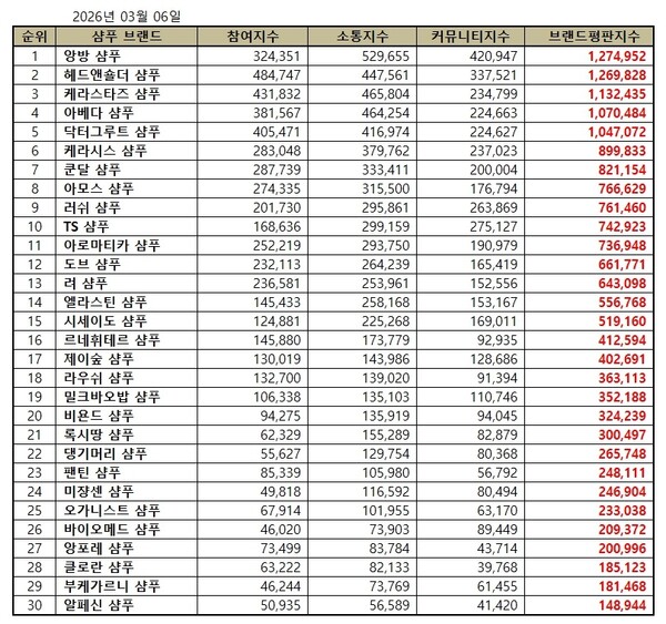 2026년 3월 샴푸 브랜드평판 순위는 앙방, 헤드앤숄더, 케라스타즈, 아베다, 닥터그루트, 케라시스, 쿤달, 아모스, 러쉬, TS, 아로마티카, 도브, 려, 엘라스틴, 시세이도, 르네휘테르, 제이숲, 라우쉬, 밀크바오밥, 비욘드, 록시땅, 댕기머리, 팬틴, 미쟝센, 오가니스트, 바이오메드, 앙포레, 클로란, 부케가르니, 알페신 샴푸 순으로 분석됐다.