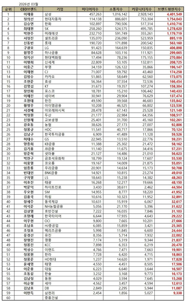 한국기업평판연구소는 2026년 2월 6일부터 2026년 3월 6일까지의 60명 CEO 브랜드 빅데이터 15,707,741개를 분석한 결과 지난 2월 CEO 브랜드 빅데이터 13,215,294개와 비교하면 18.86% 증가했다고 밝혔다.