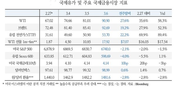 6일 기준 서부 텍사스산 원유인 WTI유 가격이 배럴당 90.90달러로 전주말 대비 27.6%, 중동 사태 이후 36% 상승세를 나타내며 주간 단위 역대 최고수준의 상승률, 올해 연간 상승률도 60%에 육박하는 모습을 연출했다.