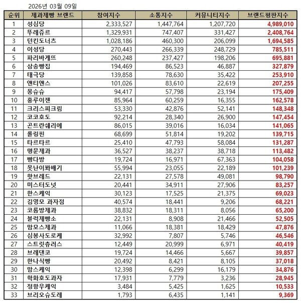 한국기업평판연구소는 대한민국 소비자들에게 사랑받는 제과제빵 전문점 브랜드 33개에 대해 2026년 2월 9일부터 2026년 3월 9일까지의 제과제빵 전문점 브랜드 빅데이터 13,459,865개를 분석한 결과 지난 2월에 분석된 제과제빵 전문점 브랜드 빅데이터 13,589,525개와 비교하면 0.95% 줄어들었다고 밝혔다.