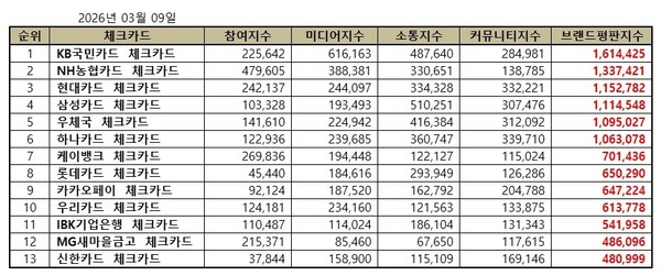 2026년 3월 체크카드 브랜드평판 순위는 KB국민카드, NH농협카드, 현대카드, 삼성카드, 우체국, 하나카드, 케이뱅크, 롯데카드, 카카오페이, 우리카드, IBK기업은행, MG새마을금고, 신한카드 체크카드 순이었다.