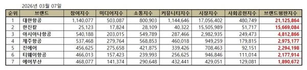 한국기업평판연구소는 항공사 상장기업 7개 브랜드에 대해 2026년 2월 9일부터 2026년 3월 9일까지의 항공사 상장기업 브랜드 빅데이터 50,945,775개를 분석한 결과 지난 2월 항공사 상장기업 브랜드 빅데이터 47,974,045개와 비교하면 6.19% 증가했다고 밝혔다.