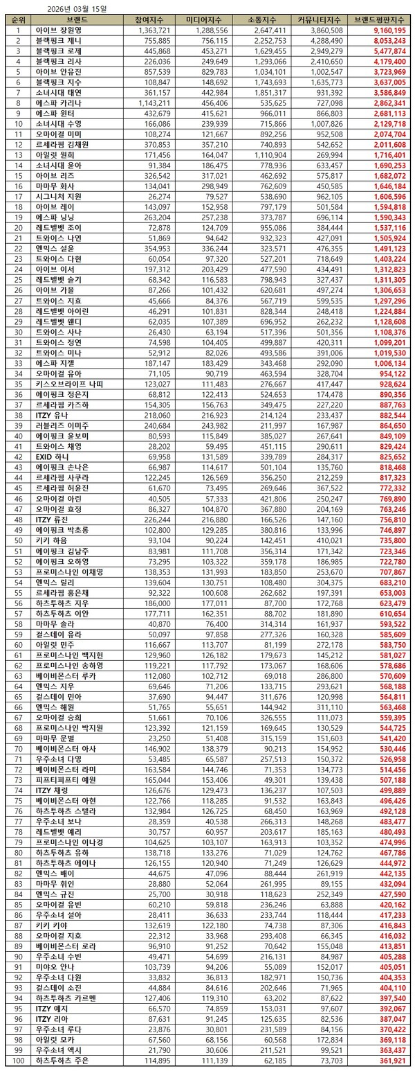 걸그룹 2026년 3월 브랜드평판...아이브, 블랙핑크, 트와이스 順