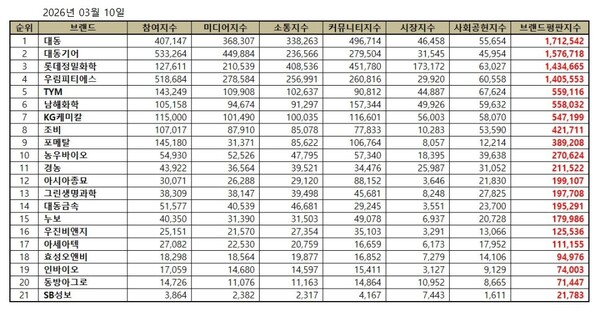 농업 상장기업 2026년 3월 브랜드평판...대동, 대동기어, 롯데정밀화학 順