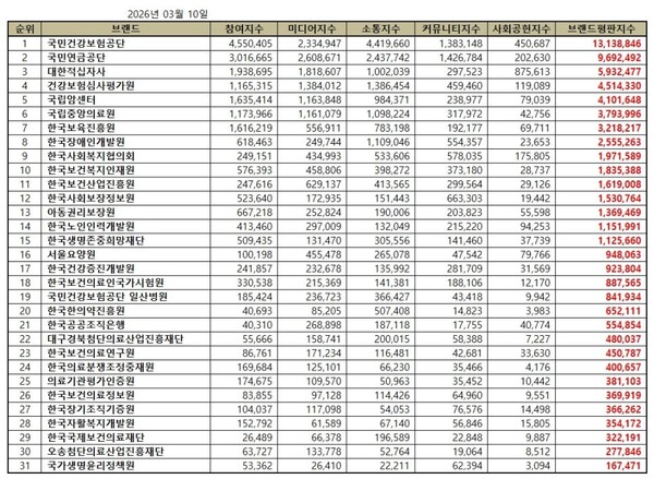 2026년 3월 보건복지부 공공기관 브랜드평판 순위는 국민건강보험공단, 국민연금공단, 대한적십자사, 건강보험심사평가원, 국립암센터, 국립중앙의료원, 한국보육진흥원, 한국장애인개발원, 한국사회복지협의회, 한국보건복지인재원, 한국보건산업진흥원, 한국사회보장정보원, 아동권리보장원, 한국노인인력개발원, 한국생명존중희망재단, 서울요양원, 한국건강증진개발원, 한국보건의료인국가시험원, 국민건강보험공단 일산병원, 한국한의약진흥원, 한국공공조직은행, 대구경북첨단의료산업진흥재단, 한국보건의료연구원, 한국의료분쟁조정중재원, 의료기관평가인증원, 한국보건의료정보원, 한국장기조직기증원, 한국자활복지개발원, 한국국제보건의료재단, 오송첨단의료산업진흥재단, 국가생명윤리정책원 순이었다.