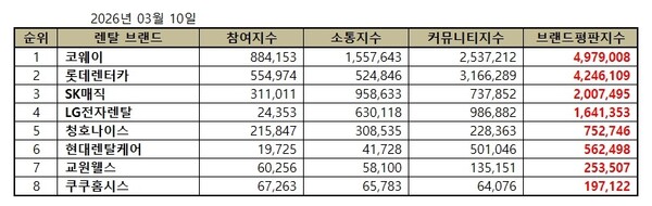 2026년 3월 렌탈 브랜드평판 빅데이터 분석 순위는 코웨이, 롯데렌터카, SK매직, LG전자렌탈, 청호나이스, 현대렌탈케어, 교원웰스, 쿠쿠홈시스 순으로 나타났다.
