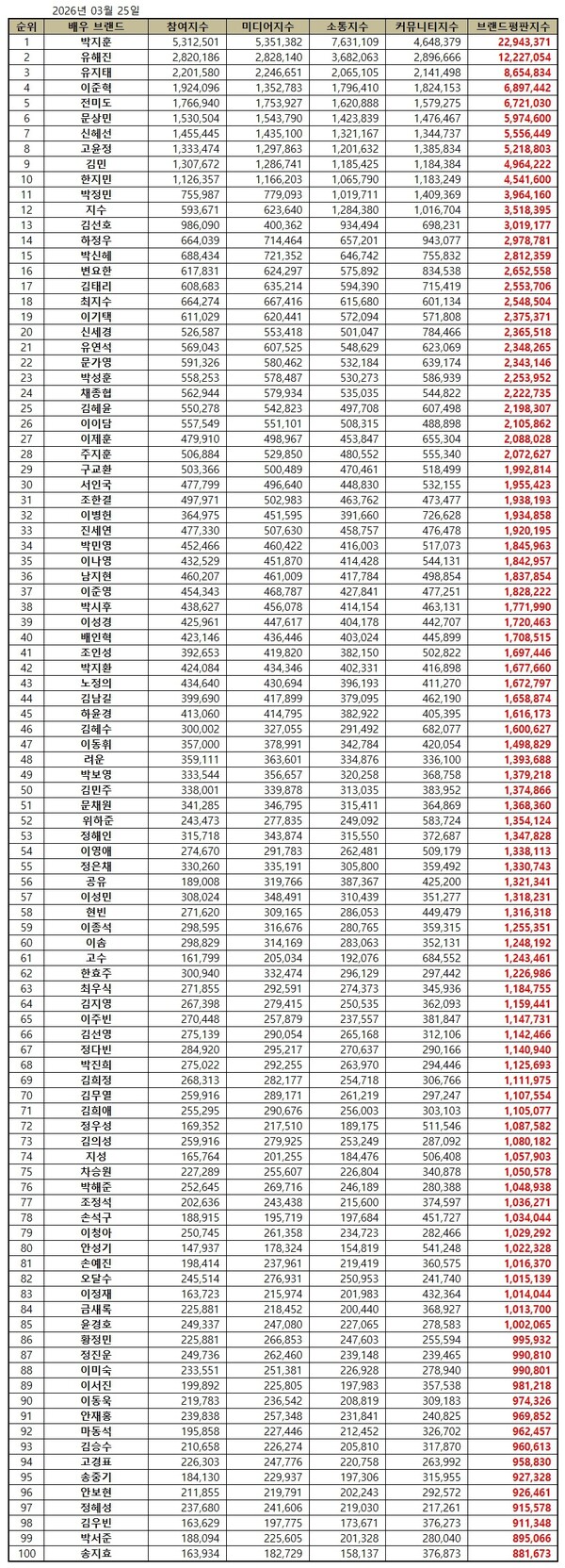 한국기업평판연구소는 2026년 2월 25일부터 2026년 3월 25일까지 방영한 드라마, 영화, OTT에서 출연중인 배우 100명의 브랜드 빅데이터 222,633,892개를 소비자들의 브랜드 참여량, 미디어량, 소통량, 커뮤니티량으로 측정하여 브랜드평판 알고리즘으로 지수화한 결과 지난 2월 배우 브랜드 빅데이터 164,889,996개와 비교하면 35.02% 증가했다고 밝혔다.