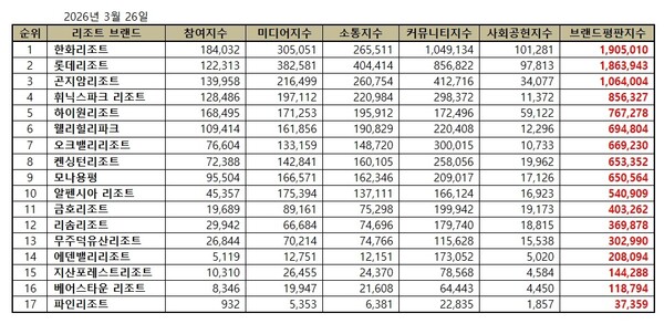 2026년 3월 리조트 브랜드평판 순위는 한화리조트, 롯데리조트, 곤지암리조트, 휘닉스파크 리조트, 하이원리조트, 웰리힐리파크, 오크밸리리조트, 켄싱턴리조트, 모나용평, 알펜시아 리조트, 금호리조트, 리솜리조트, 무주덕유산리조트, 에덴밸리리조트, 지산포레스트리조트, 베어스타운 리조트, 파인리조트 순이었다.
