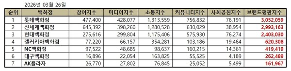 2026년 3월 백화점 브랜드평판 빅데이터 분석순위는 롯데백화점, 신세계백화점, 현대백화점, 갤러리아백화점, NC백화점, 대구백화점, AK플라자 순으로 분석됐다.