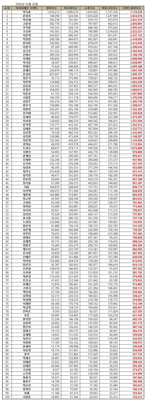 한국기업평판연구소는 2026년 2월 26일부터 2026년 3월 26일까지 측정한 라이징 배우 브랜드 빅데이터 107,948,955개를 소비자 행동분석을 통해 라이징 배우 브랜드에 대한 참여지수, 미디어지수, 소통지수, 커뮤니티지수를 측정한 결과 지난 2월 라이징 배우 브랜드빅데이터 77,003,791개와 비교하면 40.19% 증가했다고 밝혔다.