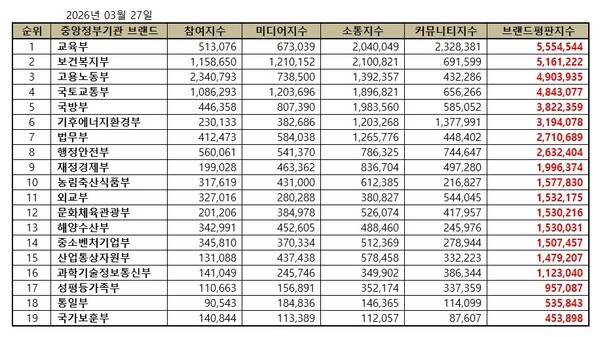 2026년 3월 대한민국 중앙정부기관 브랜드평판 순위는 교육부, 보건복지부, 고용노동부, 국토교통부, 국방부, 기후에너지환경부, 법무부, 행정안전부, 재정경제부, 농림축산식품부, 외교부, 문화체육관광부, 해양수산부, 중소벤처기업부, 산업통상자원부, 과학기술정보통신부, 성평등가족부, 통일부, 국가보훈부 순으로 분석됐다.