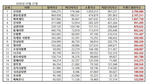 2026년 3월 라면 브랜드평판 순위는 신라면, 불닭볶음면, 짜파게티, 진라면, 삼양라면, 틈새라면, 진짬뽕, 육개장 사발면, 안성탕면, 열라면, 오징어짬뽕, 너구리, 팔도비빔면, 참깨라면, 왕뚜껑, 김치사발면, 사리곰탕면, 꼬꼬면, 짜짜로니 순으로 나타났다.