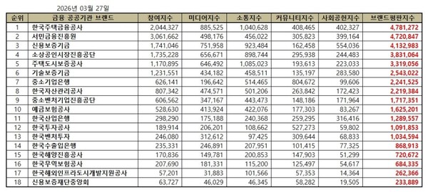 2026년 3월 금융 공공기관 브랜드평판 순위는 한국주택금융공사, 서민금융진흥원, 신용보증기금, 소상공인시장진흥공단, 주택도시보증공사, 기술보증기금, 중소기업은행, 한국자산관리공사, 중소벤처기업진흥공단, 예금보험공사, 한국산업은행, 한국투자공사, 한국벤처투자, 한국수출입은행, 한국해양진흥공사, 한국무역보험공사, 한국해외인프라도시개발지원공사, 신용보증재단중앙회 순이었다.
