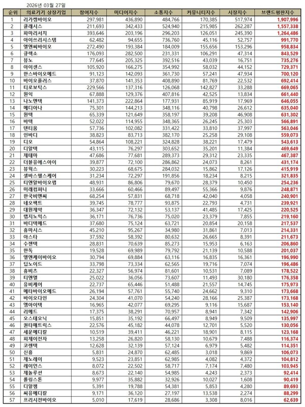 의료기기 상장기업 브랜드평판 2026년 3월 빅데이터 분석 30위 순위는 리가켐바이오, 클래시스, 파마리서치, 아이쓰리시스템, 엘앤씨바이오, 큐렉소, 뷰노, 아이센스, 한스바이오메드, 바이오플러스, 티로보틱스, 원익, 나노엔텍, 메디아나, 원텍, 바텍, 덴티움, 인바디, 디오, 디알텍, 제테마, 더블유에스아이, 뷰웍스, 셀바스헬스케어, 티앤알바이오팹, 미래컴퍼니, 한국비엔씨, 네오펙트, 대원제약, 랩지노믹스 순이었다.