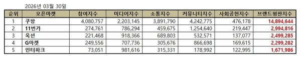 2026년 3월 오픈마켓 브랜드평판 순위는 쿠팡, 11번가, 옥션, G마켓, 인터파크 순으로 분석됐다.