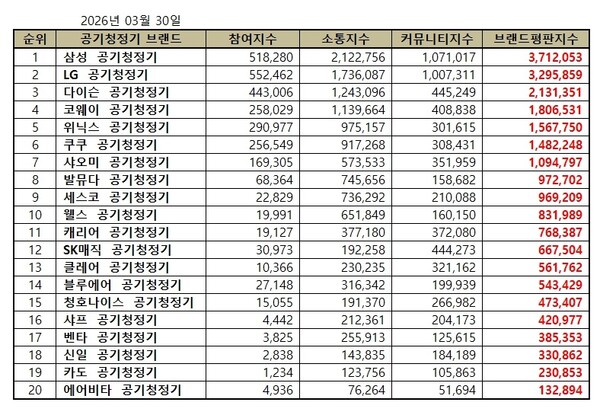 2026년 3월 공기청정기 브랜드평판 순위는 삼성, LG, 다이슨, 코웨이, 위닉스, 쿠쿠, 샤오미, 발뮤다, 세스코, 웰스, 캐리어, SK매직, 클레어, 블루에어, 청호나이스, 샤프, 벤타, 신일, 카도, 에어비타 공기청정기 순으로 나타났다.