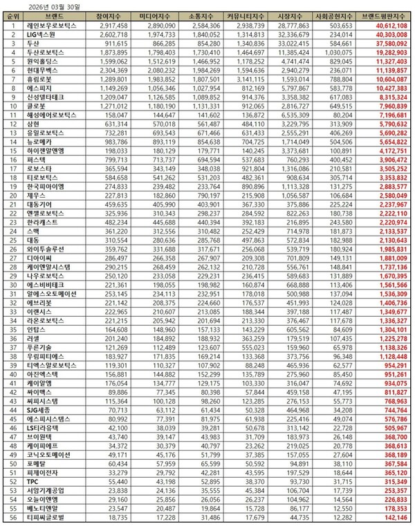 한국기업평판연구소는 로봇 상장기업 56개 브랜드에 대해 2026년 2월 28일부터 2026년 3월 30일까지 로봇 상장기업 브랜드 빅데이터 281,695,902개를 분석한 결과 지난 12월 로봇 상장기업 브랜드평판 데이터 219,560,938개와 비교하면 28.30% 증가했다고 밝혔다.