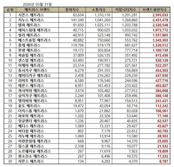 한국기업평판연구소는 국내 소비자에게 사랑받는 매트리스 브랜드 30개에 대해 2026년 2월 28일부터 2026년 3월 31일까지의 매트리스 브랜드 빅데이터 19,915,690개를 분석한 결과 지난 1월 매트리스 브랜드 빅테이터 20,766,519개와 비교하면 4.10% 줄어들었다고 밝혔다.