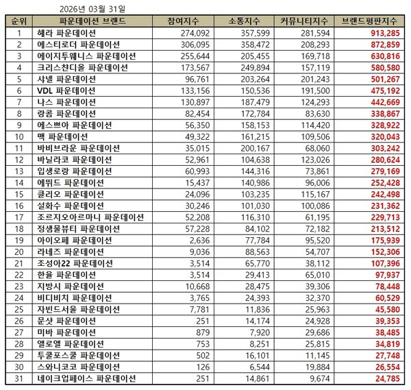파운데이션 2026년 3월 브랜드평판...헤라, 에스티로더, 에이지투웨니스 順