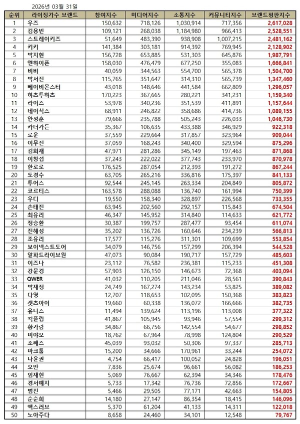 라이징 가수 2026년 3월 브랜드평판... 우즈, 김용빈, 스트레이키즈 順