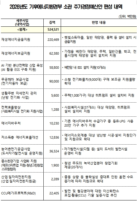 기후에너지환경부는 3월 31일 국무회의에서 재생에너지 중심으로 에너지 전환을 가속화하고 유가 상승에 따른 에너지 비용 부담을 완화하기 위해 이같은 추가경정예산안을 편성했다고 밝혔다. 2026년도 기후에너지환경부 추가경정예산안은 향후 국회의 심의·의결을 거쳐 최종 확정될 예정이다.