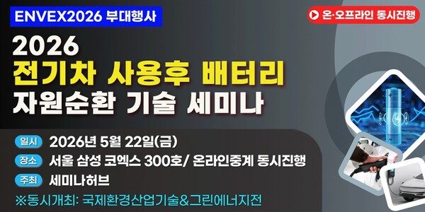 이러한 흐름 속에서 세미나허브는 오는 5월 22일 서울 삼성 코엑스 컨퍼런스룸 300호에서 ‘2026 전기차 사용후 배터리 자원순환 기술 세미나’를 개최한다. 이번 행사는 국제환경산업기술&그린에너지전(ENVEX2026)의 부대행사로 진행된다.