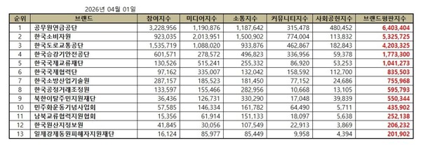 한국기업평판연구소는 행정안전 관련 공공기관 13개 브랜드에 대해 2026년 3월 1일부터 2026년 4월 1일까지의 행정안전 공공기관 브랜드 빅데이터 22,580,808개를 분석한 결과 지난 3월 행정안전 공공기관 브랜드 빅데이터 31,845,763개와 비교하면 29.09% 줄어들었다고 밝혔다.