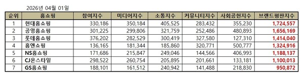 2026년 4월 TV홈쇼핑 브랜드평판 순위는 현대홈쇼핑, 공영홈쇼핑, 롯데홈쇼핑, 홈앤쇼핑, NS홈쇼핑, CJ온스타일, GS홈쇼핑 순이었다.