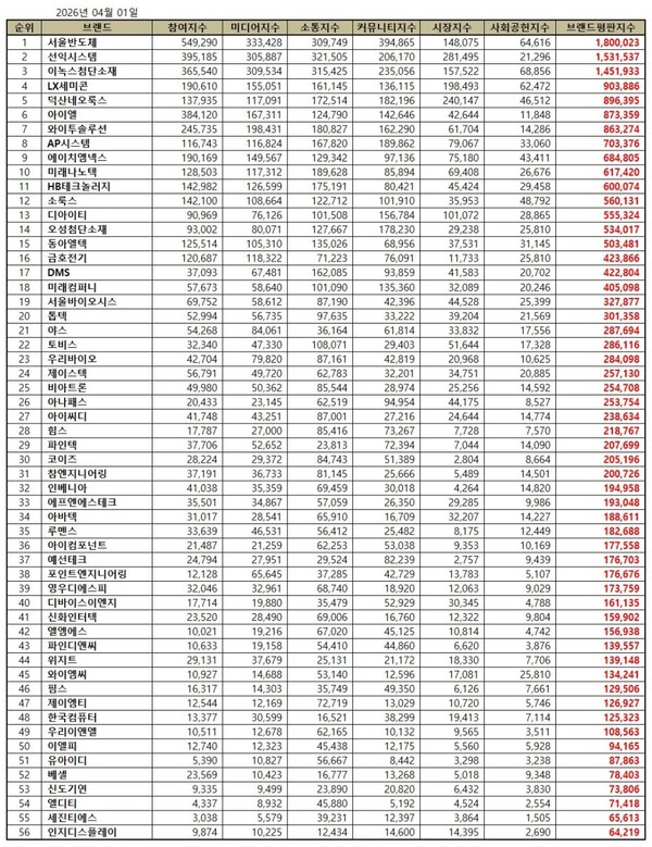 한국기업평판연구소는 디스플레이장비 상장기업 56개 브랜드에 대해 2026년 3월 1일부터 2026년 4월 1일까지의 디스플레이장비 상장기업 브랜드 빅데이터 21,035,283개를 분석한 결과 지난 3월 디스플레이장비 상장기업 브랜드 빅데이터 19,596,085개와 비교하면 7.34% 증가했다고 밝혔다.