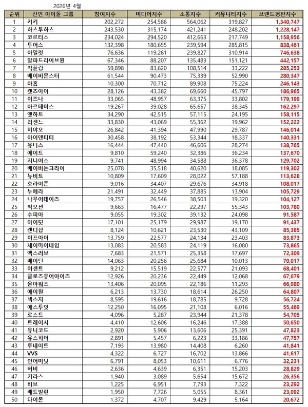 2026년 4월 신인 아이돌그룹 브랜드평판 30위 순위는 키키, 하츠투하츠, 코르티스, 투어스, 아일릿 , 알파드라이브원, 킥플립, 베이비몬스터, 아홉, 캣츠아이, 이즈나, 아르테미스, 앳하트, 리센느, 미야오, 아이덴티티, 유니스, 에이트, 지니어스, 베이비돈크라이, 뉴비트, 호라이즌, 누에라, 나우어데이즈, 빅오션, 수피아, 아이딧, 캔디샵, 이프아이, 세이마이네임 순으로 분석됐다.