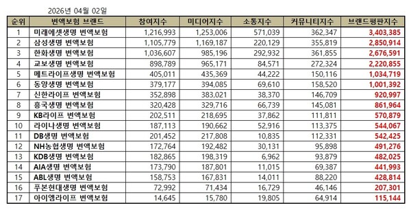 2026년 4월 변액보험 브랜드평판 순위는 미래에셋생명, 삼성생명, 한화생명, 교보생명, 메트라이프생명, 동양생명, 신한라이프, 흥국생명, KB라이프, 라이나생명, DB생명, NH농협생명, KDB생명, AIA생명, ABL생명, 푸본현대생명, 아이엠라이프 변액보험 순으로 나타났다.