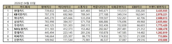 한국기업평판연구소는 2026년 3월 3일부터 2026년 4월 3일까지의 국내 신용카드 브랜드 빅데이터 17,289,560개를 분석하여 소비자들의 참여와 미디어, 소통, 커뮤니티, 사회공헌, CEO 지표를 측정한 결과 지난 3월 신용카드 브랜드 빅데이터 18,550,156개와 비교하면 6.80% 줄어들었다고 밝혔다.