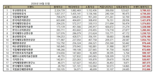 한국기업평판연구소는 해양수산부 공공기관 19개 브랜드에 대해 2026년 3월 3일부터 2026년 4월 3일까지의 해양수산부 공공기관 브랜드 빅데이터 27,003,233개를 분석한 결과 지난 3월 해양수산부 공공기관 브랜드 빅데이터 27,576,053개와 비교하면 2.08% 줄어들었다고 밝혔다.