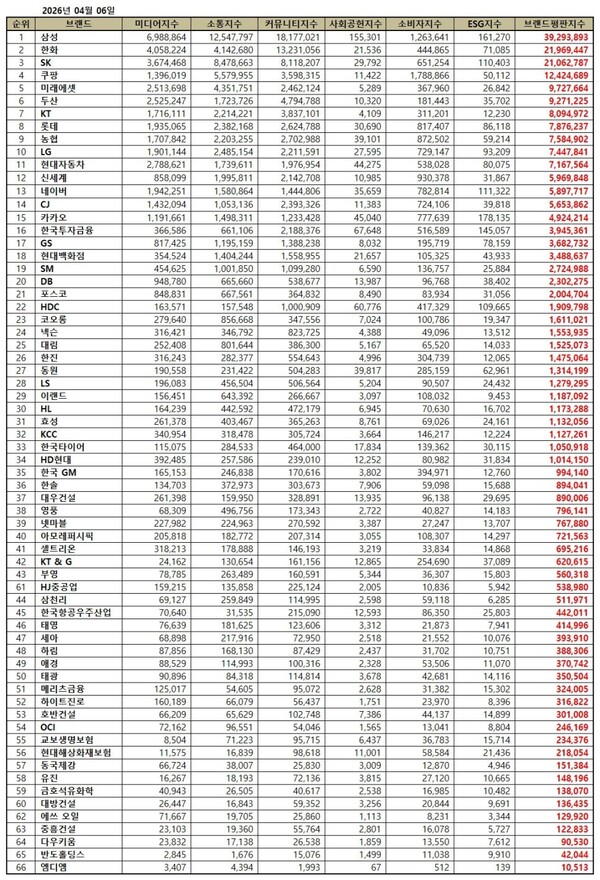 한국기업평판연구소는 2026년 3월 6일부터 2026년 4월 6일까지의 66개 대기업집단 브랜드 빅데이터 222,830,406개를 분석한 결과 지난 3월 브랜드 빅데이터 191,408,939개와 비교하면 16.42% 증가했다고 밝혔다.