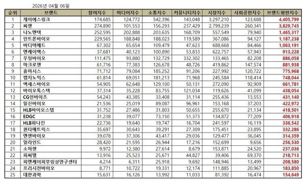 생명과학서비스 상장기업 2026년 4월 브랜드평판...제이에스링크, 씨젠, 나노엔텍 順