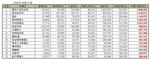 한국기업평판연구소는 국내 교육서비스 상장기업에 대해 2026년 3월 7일부터 2026년 4월 7일까지의 교육서비스 상장기업 브랜드 빅데이터 11,496,107개를 분석한 결과 지난 3월 교육서비스 상장기업 브랜드 빅데이터 10,344,288개와 비교하면 11.13% 증가했다고 밝혔다.