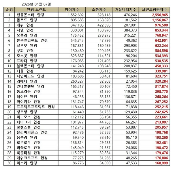 2026년 4월 안경 브랜드평판 30위 순위는 젠틀몬스터, 톰포드, 래쉬, 샤넬, 오클리, 블루엘리펀트, 실루엣, 구찌, 모스콧, 프라다, 블랙몬스터, 디올, 나인어코드, 리에티, 안네발렌틴, 톰브라운, 레이밴, 마이키타, 프로젝트프로덕트, 생로랑, 마노모스, 페이크미, 로렌스폴, 올리버피플스, 몽블랑, 로우로우, 리끌로우, 룩옵티컬, 애쉬크로프트, 마스카 안경 순으로 분석됐다.