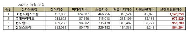전자유통점 2026년 4월 브랜드평판...LG전자베스트샵, 롯데하이마트, 전자랜드 順