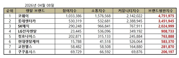 2026년 4월 렌탈 브랜드평판 빅데이터 분석 순위는 코웨이, 롯데렌터카, SK매직, LG전자렌탈, 청호나이스, 현대렌탈케어, 교원웰스, 쿠쿠홈시스 순으로 나타났다.