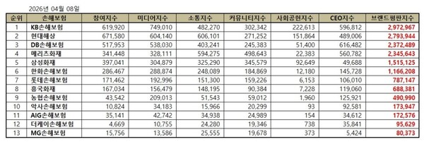 2026년 4월 손해보험 브랜드평판 순위는 KB손해보험, 현대해상, DB손해보험, 메리츠화재, 삼성화재, 한화손해보험, 롯데손해보험, 흥국화재, 농협손해보험, 악사손해보험, AIG손해보험, 더케이손해보험, MG손해보험 순이었다.