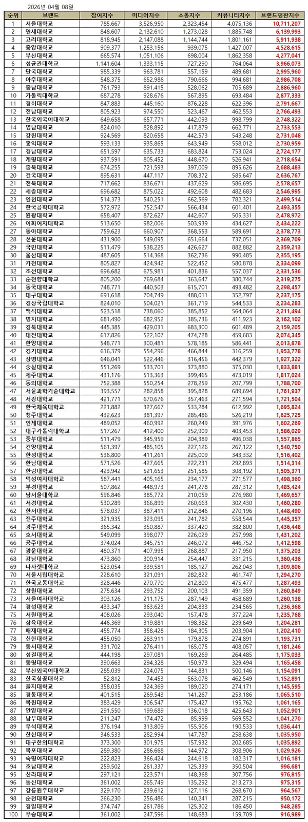 대학교 2026년 4월 브랜드평판...서울대학교, 연세대학교, 고려대학교 順