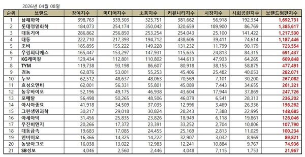 농업 상장기업 2026년 4월 브랜드평판... 남해화학, 롯데정밀화학, 대동기어 順