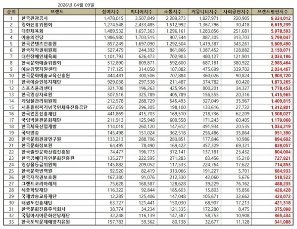 한국기업평판연구소는 문화체육관광부 공공기관 33개 브랜드에 대해 2026년 3월 9일부터 2026년 4월 9일까지의 문화체육관광부 공공기관 브랜드 빅데이터 66,722,768개를 분석한 결과 지난 3월 문화체육관광부 공공기관 브랜드 빅데이터 57,078,331개와 비교하면 16.90% 증가했다고 밝혔다.