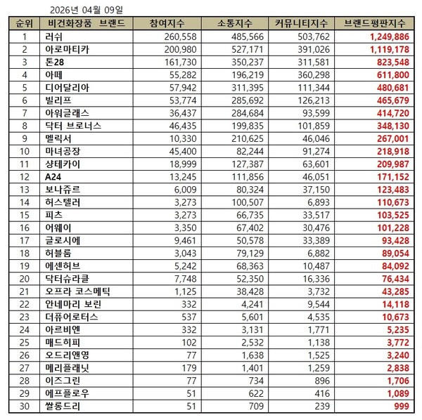 2026년 4월 비건화장품 브랜드평판 순위는 러쉬, 아로마티카, 톤28, 아떼, 디어달리아, 빌리프, 아워글래스, 닥터 브로너스, 멜릭서, 마녀공장, 샹테카이, A24, 보나쥬르, 허스텔러, 피츠, 어웨이, 글로시에, 허블룸, 에센허브, 닥터슈라클, 오프라 코스메틱, 안네마리 보린, 더퓨어로터스, 아르비엔, 매드히피, 오드리앤영, 메리플래닛, 이즈그린, 에프플로우, 쌀롱드리 순으로 분석됐다.