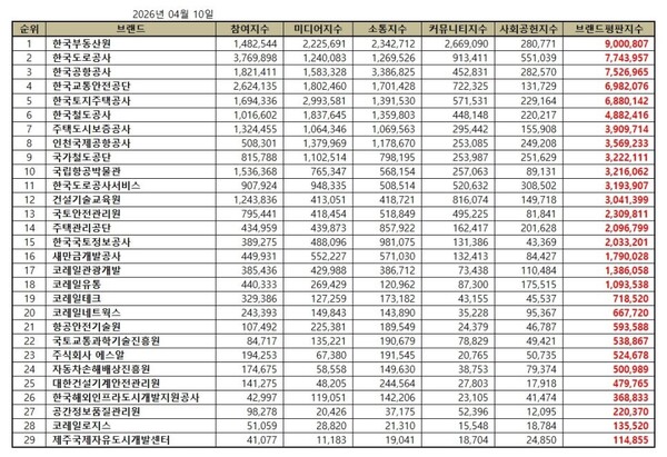 한국기업평판연구소는 국토교통부 공공기관 29개 브랜드에 대해 2026년 3월 10일부터 2026년 4월 10일까지의 국토교통부 공공기관 브랜드 빅데이터 78,741,929개를 분석한 결과 지난 3월 국토교통부 공공기관 브랜드 빅데이터 84,261,181개와 비교하면 6.55% 줄어들었다고 밝혔다.