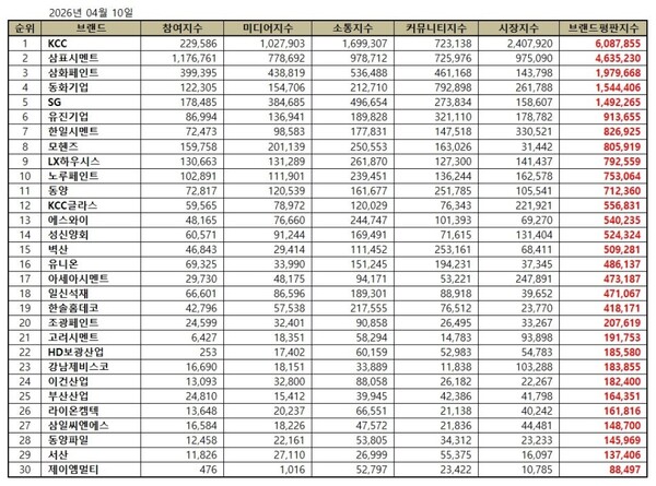 건축자재 상장기업 브랜드평판 2026년 4월 빅데이터 분석 30위 순위는 KCC, 삼표시멘트, 삼화페인트, 동화기업, SG, 유진기업, 한일시멘트, 모헨즈, LX하우시스, 노루페인트, 동양, KCC글라스, 에스와이, 성신양회, 벽산, 유니온, 아세아시멘트, 일신석재, 한솔홈데코, 조광페인트, 고려시멘트, HD보광산업, 강남제비스코, 이건산업, 부산산업, 라이온켐텍, 삼일씨엔에스, 동양파일, 서산, 제이엠멀티 순이었다.