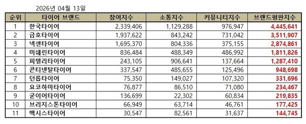 한국기업평판연구소는 소비자들에게 사랑받는 타이어 브랜드에 대해 2026년 3월 13일부터 2026년 4월 13일까지의 타이어 브랜드 빅데이터 15,988,510개를 분석한 결과 지난 3월 브랜드 빅데이터 17,631,579개와 비교하면 9.32% 줄어들었다고 밝혔다.